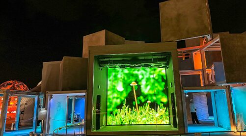 NHK関連業務で培ったハイエンドな映像制作技術を活かし、さまざまな展示映像を制作しています。全国各地の博物館や水族館、国立の施設に加え、大阪万博でも映像制作を担ってきました。4Kや8K、12Kといった高画質映像を活かした超大型スクリーンコンテンツや、360度VRを使ったイマーシブコンテンツ、さらには視聴者が操作できるインタラクティブコンテンツなど、最先端の撮影技術を活かして制作しています。