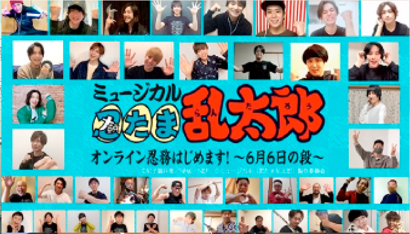ミュージカル忍たま乱太郎では、ZOOMを使って総勢24名のキャストを自宅から中継。スタジオとつなぎ、ニコニコ動画で生放送を行いました。 |