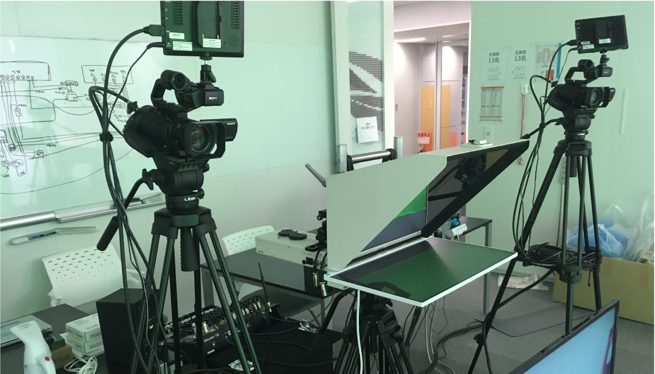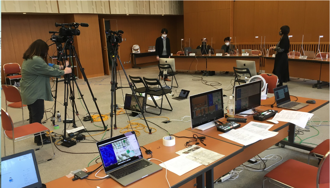 もともと学校にあった設備に加えて持ち込み機材を使用し、3台のカメラをリアルタイムにスイッチングした映像を用意し、ZOOMウェビナーでのシンポジウム配信のサポートをしました。 |