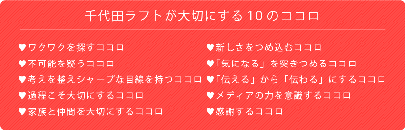株式会社千代田ラフトは、平成15年に、NHKの番組を得意とする株式会社オフィス・ラフトとビデオパッケージや展示映像を得意とする株式会社千代田ソフトプランニングという二つの会社が合併してできました。